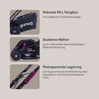 Mit einer Schnittbreite von 43 cm ist der gomag Akku-Rasenmäher GO-RSM430BL ideal für größere Gärten geeignet. Die zentrale Schnitthöhenverstellung in 6 Stufen von 25 – 75 mm und der beidseitige Rasenkanteneinzug garantieren ein optimales Mähergebnis. Der kraftvolle und langlebige bürstenlose (brushless) Motor sorgt für einen besonders hohen Wirkungsgrad, eine längere Laufzeit durch einen geringeren Verschleiß. Ein einheitliches Akkusystem für die gesamte gomag ProduktSerie – alle Akkus und Ladegeräte der gomag 20 V Serie sind mit dem GO-RSM430BL kompatibel.
