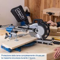 Mit Hilfe der Zugfunktion sägt die Kappsäge mühelos Werkstücke bis 340 mm Breite und 65 mm Höhe. Dank der stabilen Doppelsäulenführung lässt sich das Sägeblatt präzise durch das Werkstück führen. Der breite Griff und der vollständig geschlossene Sägeblatt-Schutz sorgen dabei für maximale Sicherheit des Benutzers der Zug- und Kappsäge.