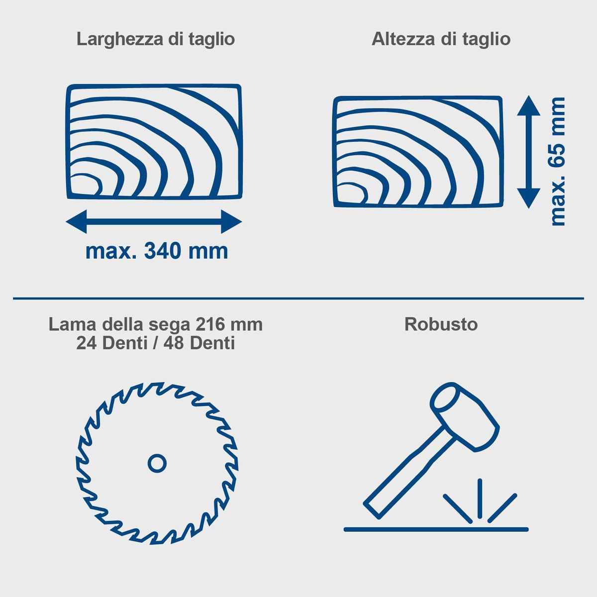 Gleichzeitig sorgt ein leistungsstarker 2000 W Motor für eine maximale Sägeblatt-Drehzahl von 4700 Umdrehungen pro Minute und macht die Bearbeitung verschiedener Materialien möglich. Die HM216 eignet sich für Hart- und Weichholz sowie für alle gängigen Kunststoffe. Die beiden mitgelieferten Hartmetall-Sägeblätter, eines mit 24 Zähnen eines mit 48 Zähnen, haben einen Durchmesser von 216 mm.